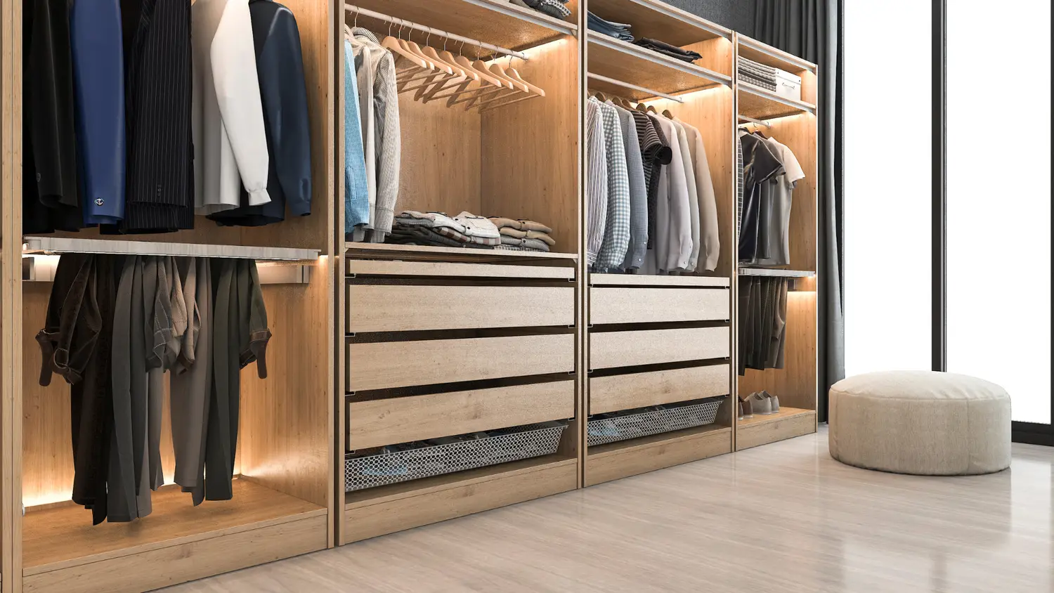 Desenvolvemos roupeiros personalizados, com soluções de arrumação e acabamentos.